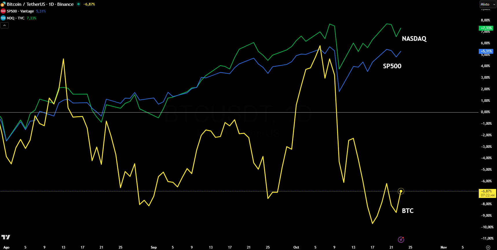 Mira lo que está ocurriendo con Bitcoin comparado con SP500 y Nasdaq.