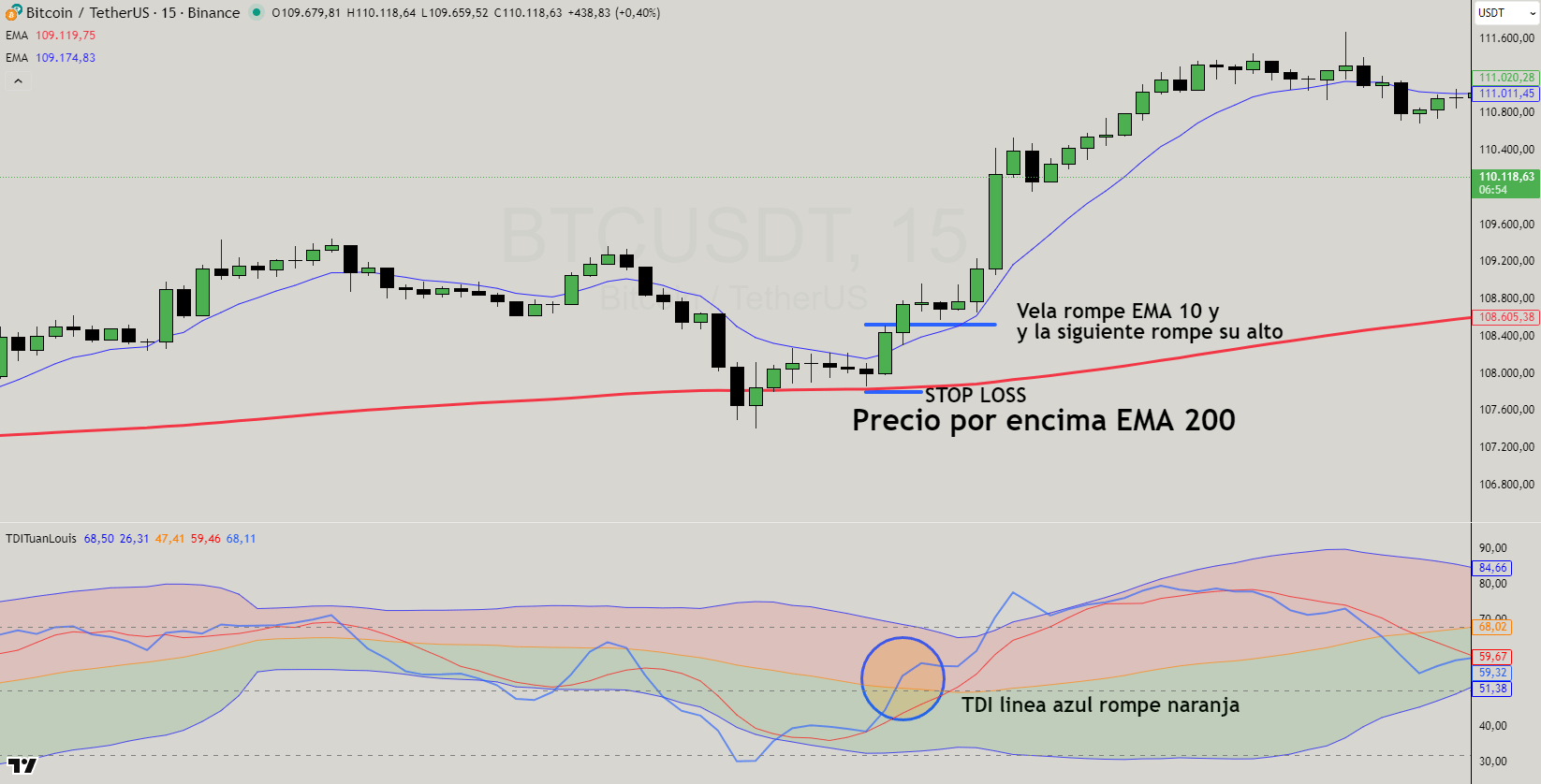 Vemos la tendencia, precio por encima de EMA 200 alcista, por debajo bajista.